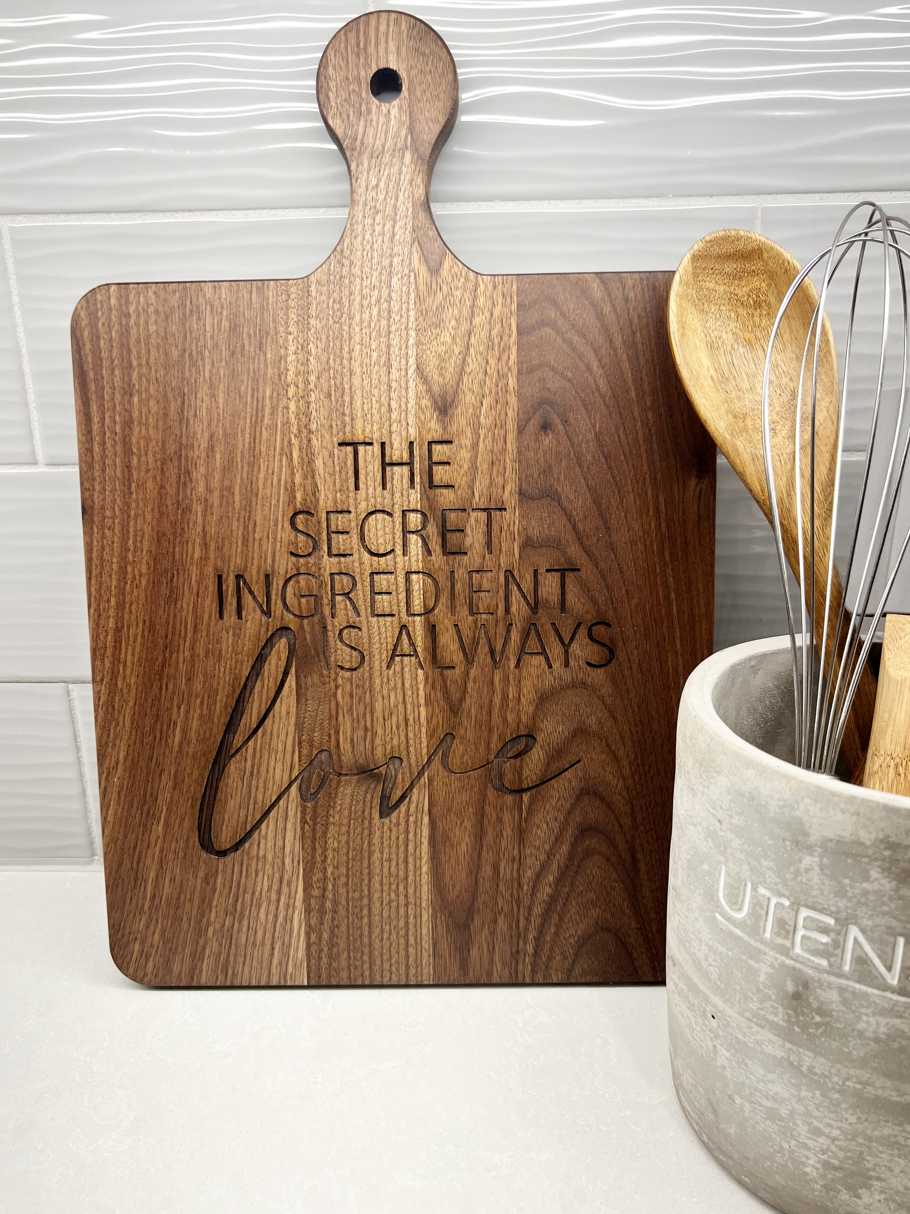 We use a CO2 laser engraver that burns and etches the wood. We do not stain the cutting boards. The color you see reflects the natural color of the wood. The engraving on walnut is more subtle than on maple. Due to the natural variations in wood, each cutting board is unique and you may notice slight variations in color, tone, grain and engraving from the pictures shown in our pictures. This just makes your cutting board one-of-a-kind!