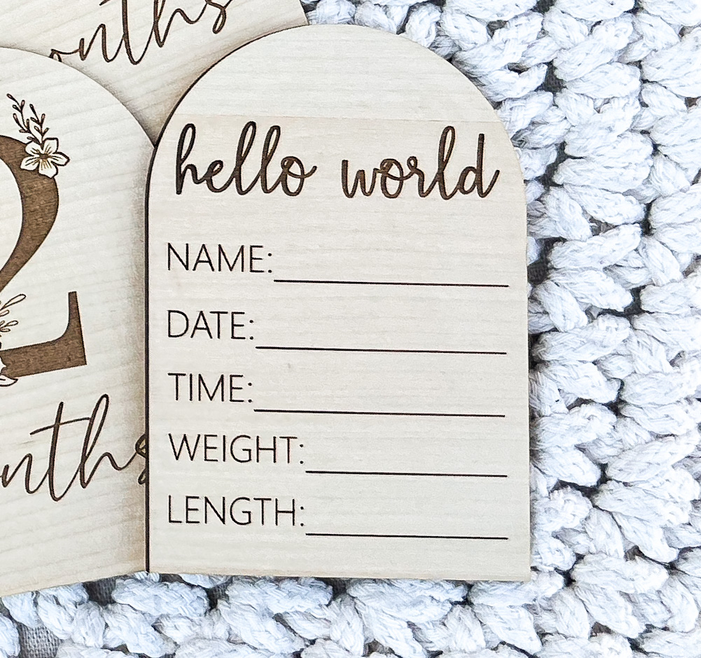 Announce your newborns arrival with our generic Birth Announcement. Record details using a permanent marker. Words are laser engraved on 1/8" veneered Birch wood.