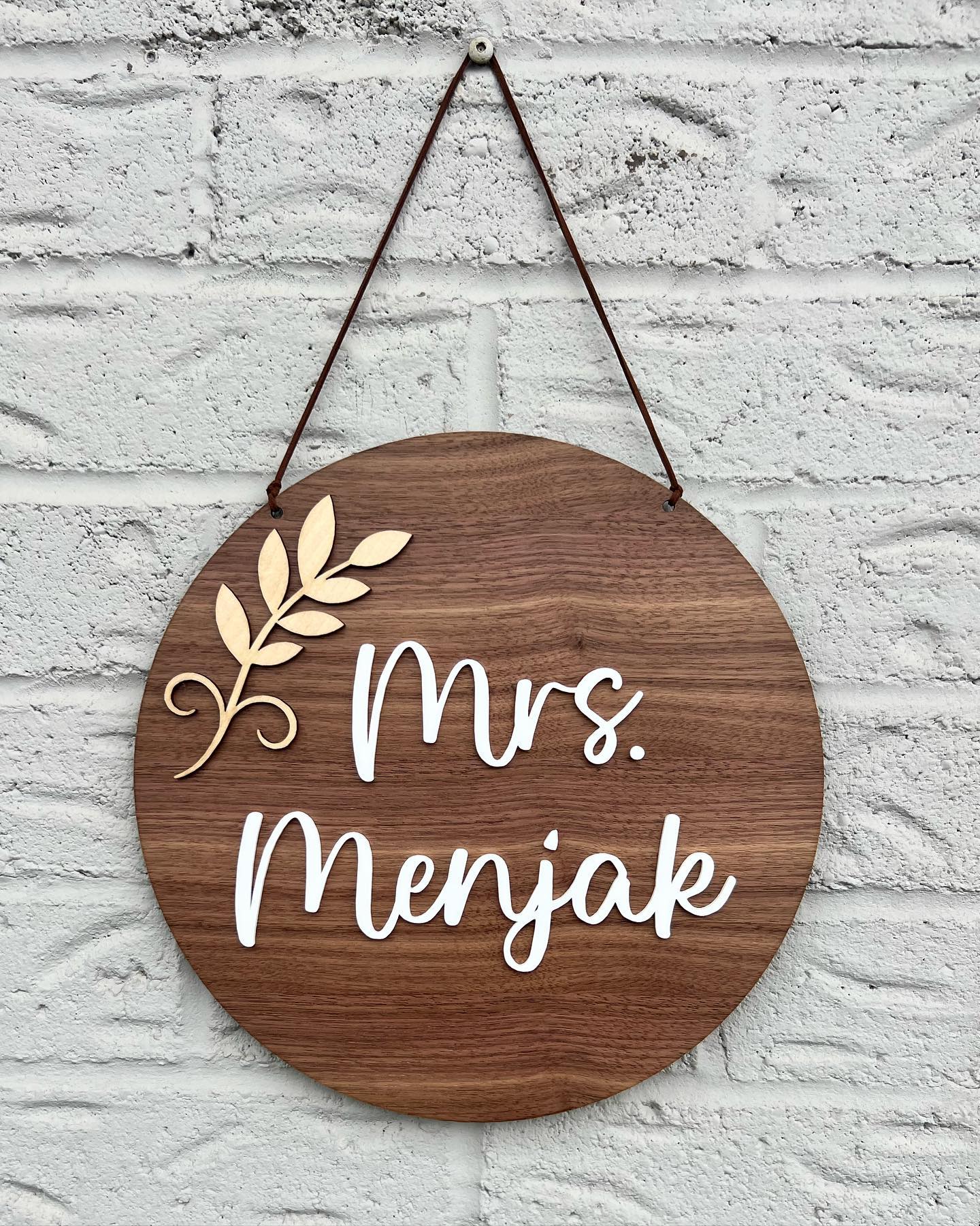 Classroom signs are made with 1/8" veneered Birch wood, Walnut wood and White Acrylic and includes Suede Ribbon. Measures 11".