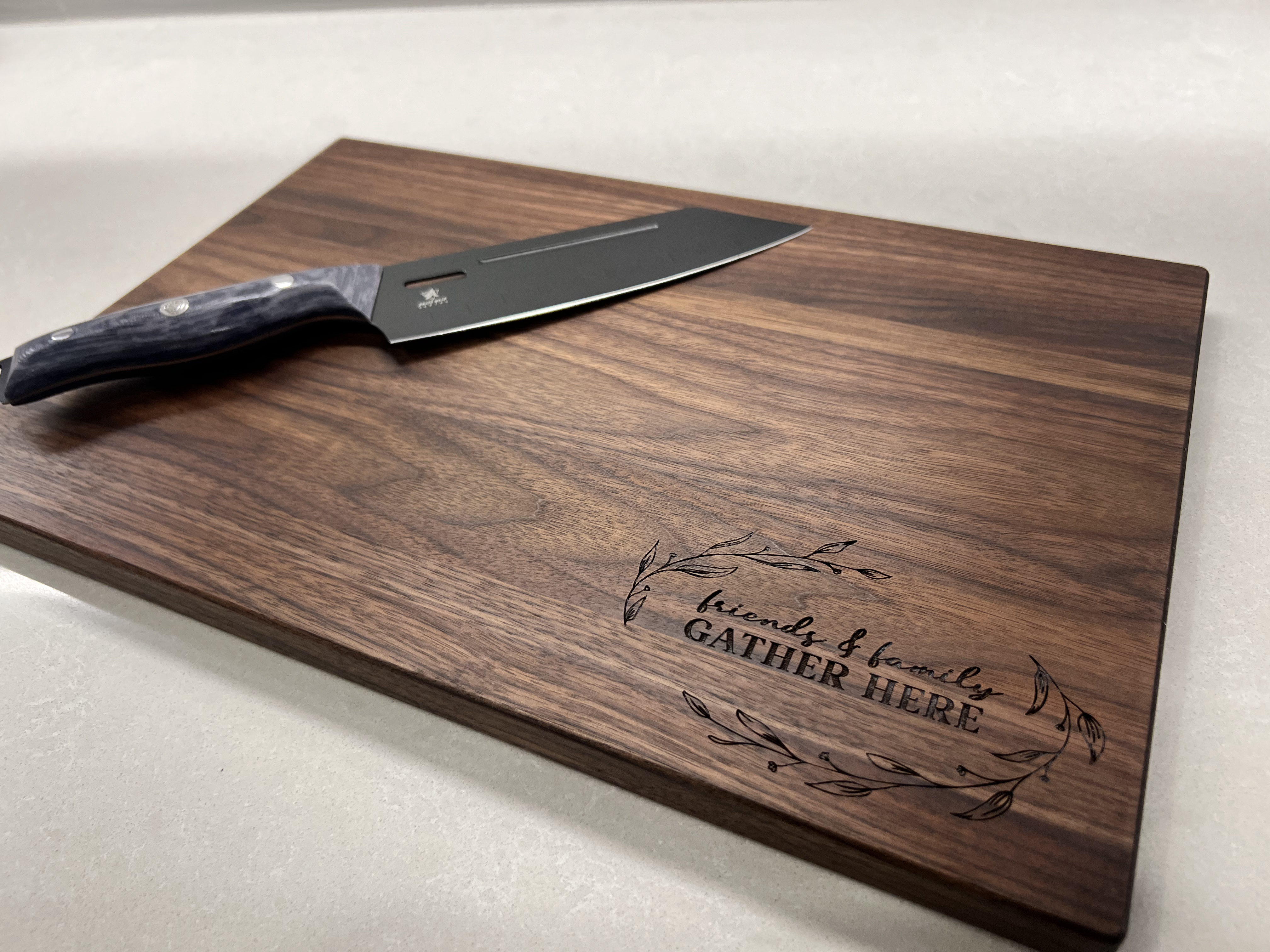 We use a CO2 laser engraver that burns and etches the wood. We do not stain the cutting boards. The color you see reflects the natural color of the wood. The engraving on walnut is more subtle than on maple. Due to the natural variations in wood, each cutting board is unique and you may notice slight variations in color, tone, grain and engraving from the pictures shown in our pictures. This just makes your cutting board one-of-a-kind!